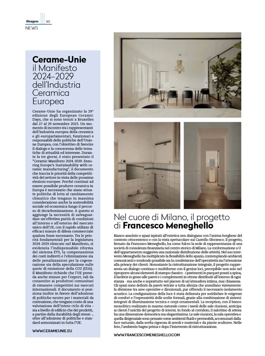 Our interior design project Uffici in Piazza Castello has been featured in the January 2024 issue of Il Bagno Oggi e Domani.