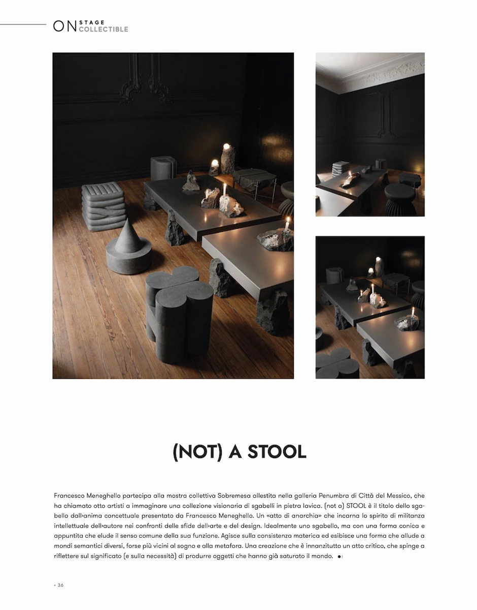 On Stage Collectible page in The Book – Contract Network (June 2024): (not a) STOOL with installation photographs in a dark setting